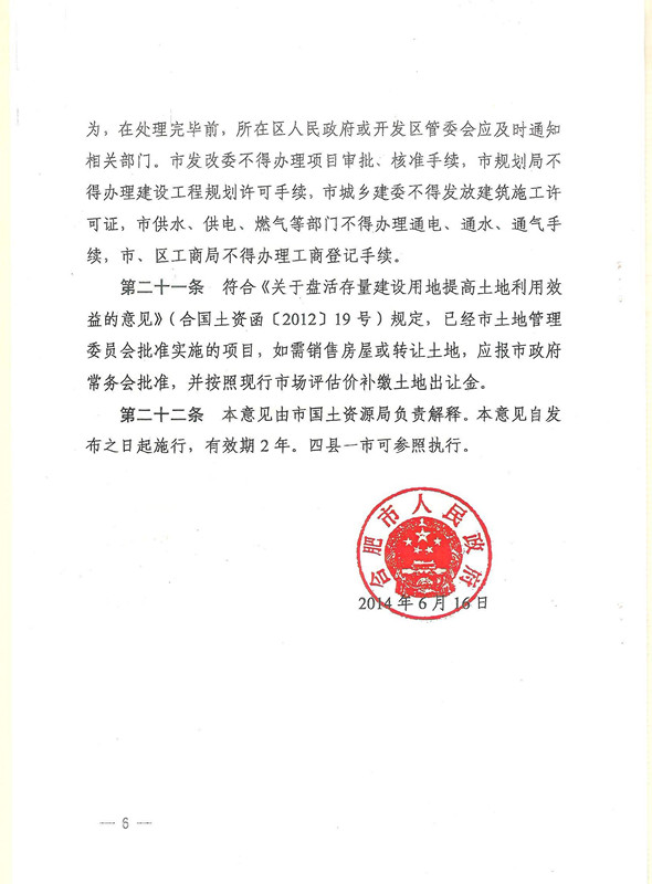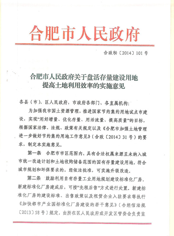 合肥市人民政府關(guān)于盤活存量建設(shè)用地提高土地利用效率的實(shí)施意見