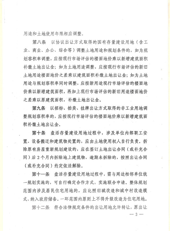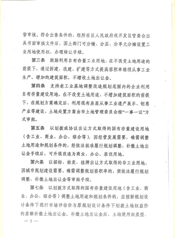 第三條  鼓勵(lì)利用自有存量工業(yè)用地,在不改變土地用途的前提下,通過拆建、改建、擴(kuò)建等方式提高容積率繼續(xù)從事工業(yè)生產(chǎn)。增加的建筑面積,不增收土地出讓金。