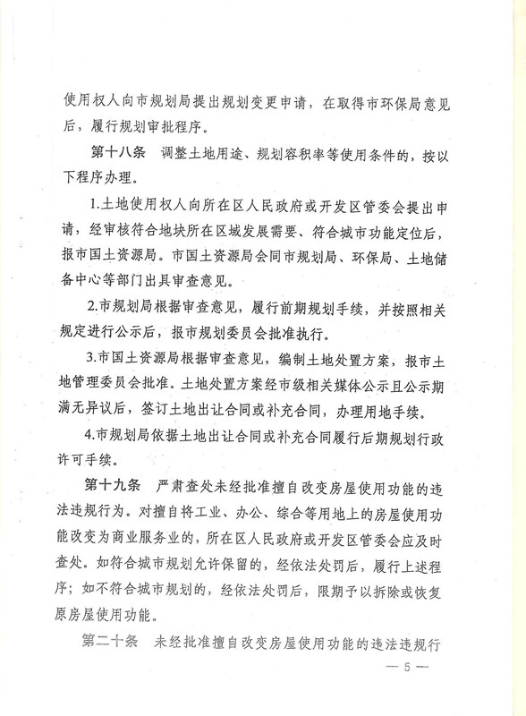 第十九條  嚴(yán)肅查處未經(jīng)批準(zhǔn)擅自改變房屋使用功能的違法違規(guī)行為。對(duì)擅自將工業(yè)、辦公、綜合等用地上的房屋使用功能改變?yōu)樯虡I(yè)服務(wù)業(yè)的,所在區(qū)人民政府或開發(fā)區(qū)管委會(huì)應(yīng)及時(shí)查處。如符合城市規(guī)劃允許保留的,經(jīng)依法處罰后,履行上述程序;如不符合城市規(guī)劃的,經(jīng)依法處罰后,限期予以拆除或恢復(fù)原房屋使用功能。