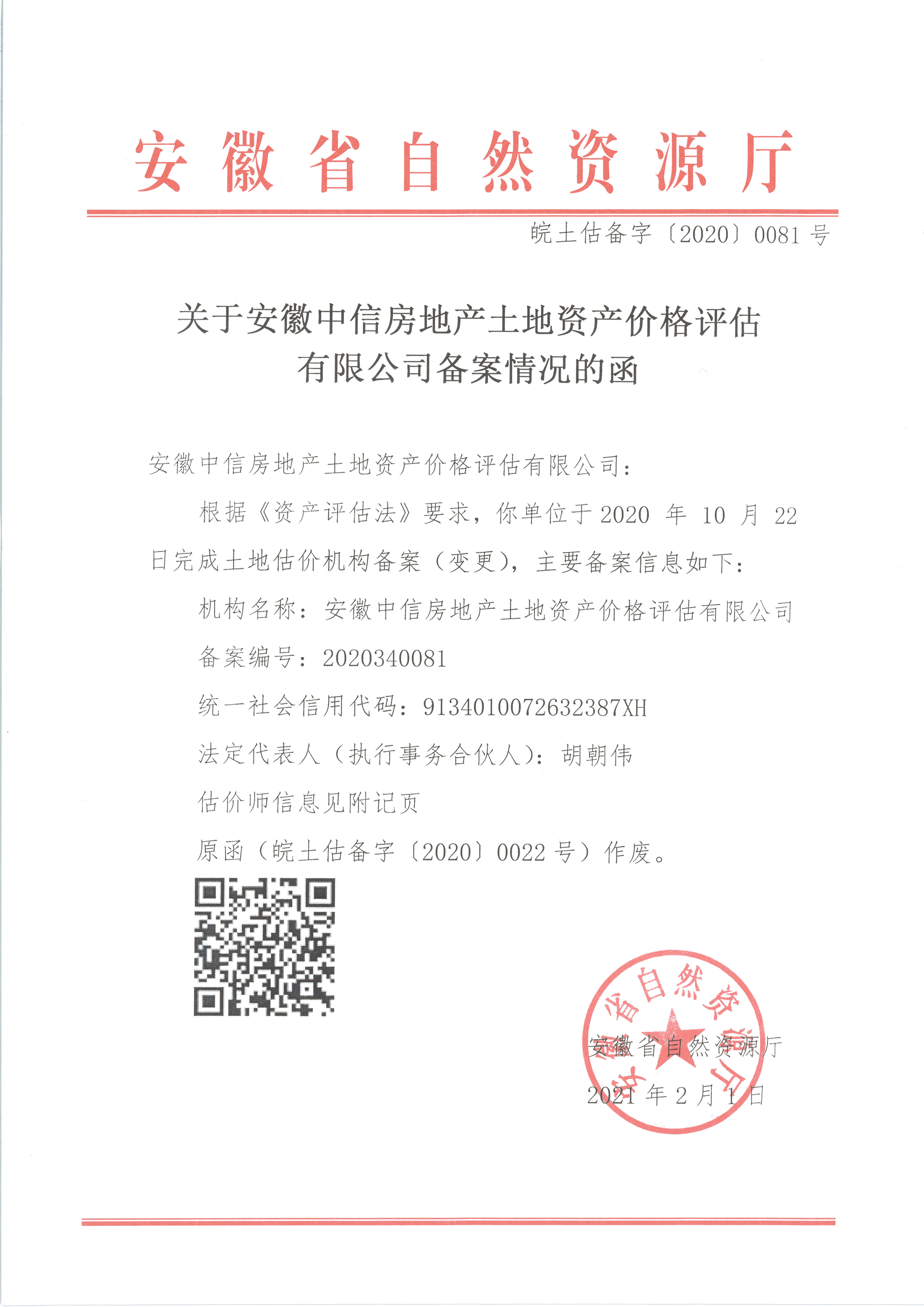 安徽省自然資源廳頒發(fā)的土地評估機構(gòu)備案函